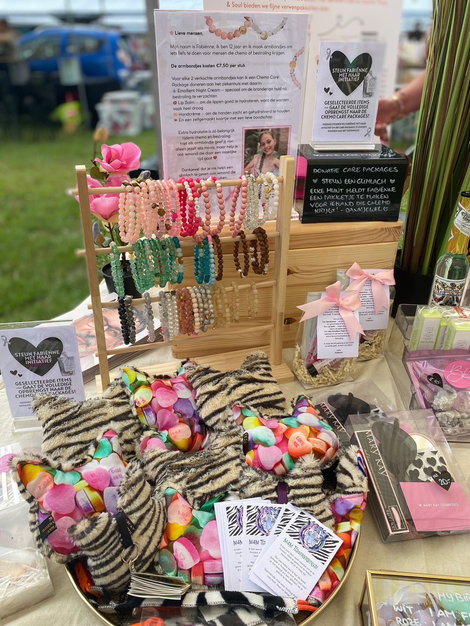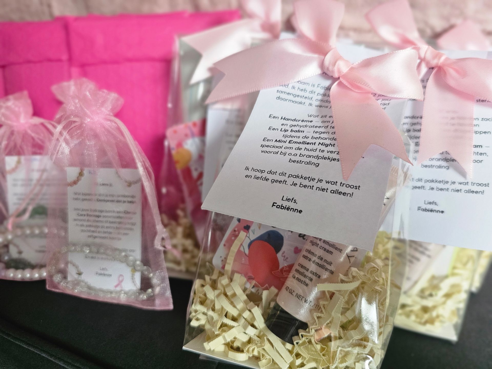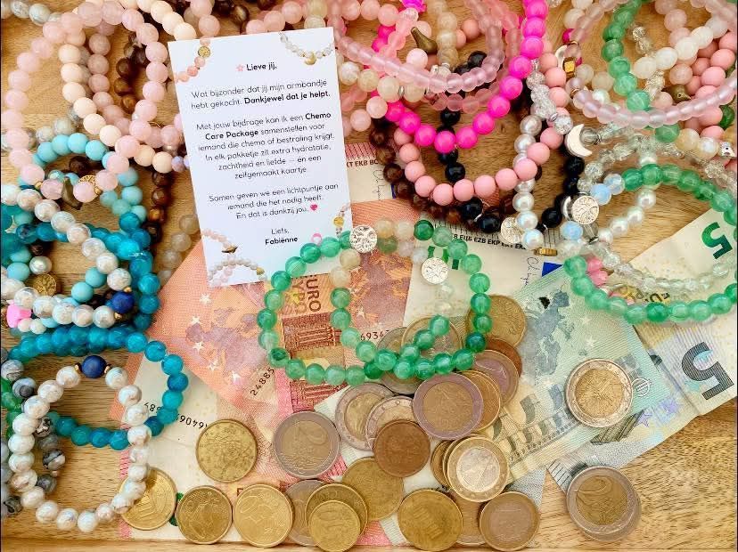 Mijn dochter Fabiënne (12 jaar) heeft een bijzonder lief en krachtig doel. Ze maakt zelf armbandjes die ze verkoopt om geld op te halen voor de Chemo Care Packages. Deze pakketten zitten vol liefde en bevatten verzorgende producten zoals een Emollient Night Cream, lip balm en handcrème, samen met een kaartje met een mooie tekst en een persoonlijk briefje van Fabiënne zelf. De pakketten worden gedoneerd aan mensen die een chemo- of bestraling behandeling ondergaan, om hen een warm steuntje in de rug te geven.